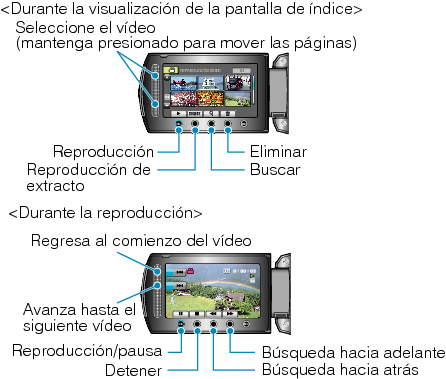 Puede seleccionar y reproducir los vídeos grabados desde la pantalla de índice (pantalla de vistas en miniatura).