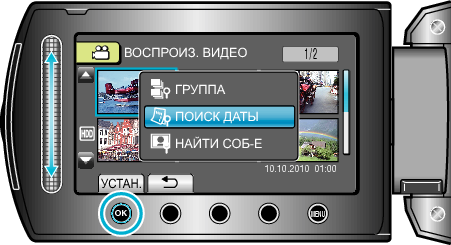 Вы также можете отобразить меню поиска, выбрав „ПОИСК“ в меню воспроизведения. Для поиска фотографий выберите „ПОИСК ДАТЫ“ в меню.
