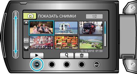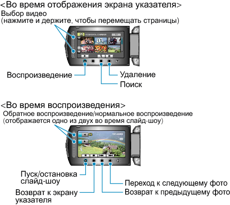 Вы можете выбрать и начать воспроизведение записанных фотографий с экрана указателя (отображаются эскизы).