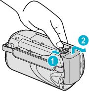 Skjut batteriluckan i öppningsriktningen när du ska ta ut batteriet ur denna enhet.