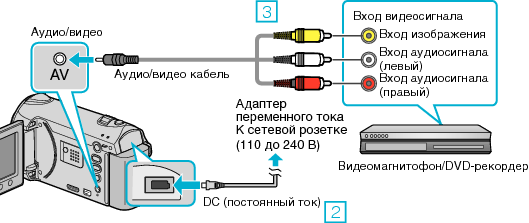 Вы можете копировать видео с этой камеры, подсоединив ее к DVD-рекордеру или видеомагнитофону.