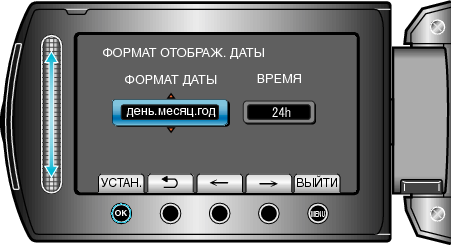 Устанавливает порядок отображения года, месяца и числа, а также формат отображения времени (24-часовой/12-часовой).