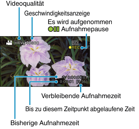 Zeigt die bisherige Aufnahmezeit des Videos an. Die Aufnahmezeit nimmt mit jedem Einzelbild zu. |