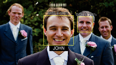 Muestra los cuadros, nombres y niveles de sonrisa (%) cuando los rostros son detectados. |