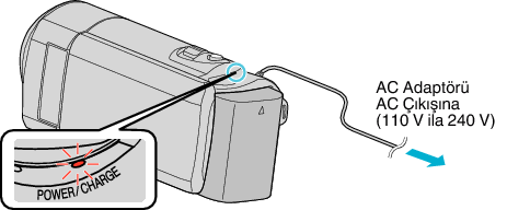 Şarj zamanı, birim 25 °C’de kullanıldığı zamandır.Eğer pil takımı, 10 °C - 35 °C’lik oda sıcaklıklığı aralığı dışında şarj edilirse, şarj işlemi daha uzun zaman alabilir ya da hiç başlamayabilir. Kaydedilebilir ve oynatılabilir süre, düşük ısıda çalıştırma gibi bazı kullanım koşulları altında kısalabilir. - Eğer sağlanan JVC AC adaptörü dışında başka bir AC adaptörü kullanıyorsanız, hatalı çalışmalar meydana gelebilir.