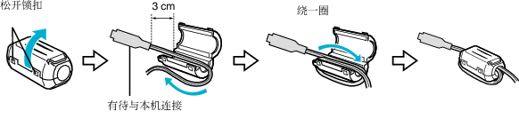 按图所示,将核心过滤器装到交流电适配器的电源线、AV电缆和备选的分量电缆上。