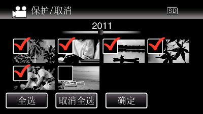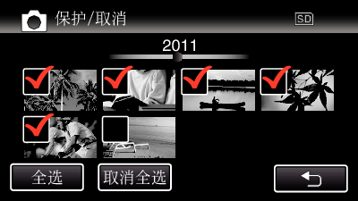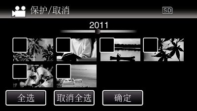 在2秒钟内连续录制的静像或用连拍模式录制的静像将放在同一个组里。 仅显示第一个录好的文件,组用绿色方框显示。 轻按时,同组文件的索引画面出现。 轻按要保护或取消保护的文件,然后轻按“