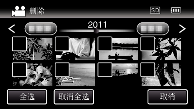 在2秒钟内连续录制的静像或用连拍模式录制的静像将放在同一个组里。 仅显示第一个录好的文件,组用绿色方框显示。 轻按时,同组文件的索引画面出现。 轻按要删除的文件,然后轻按“ ”。