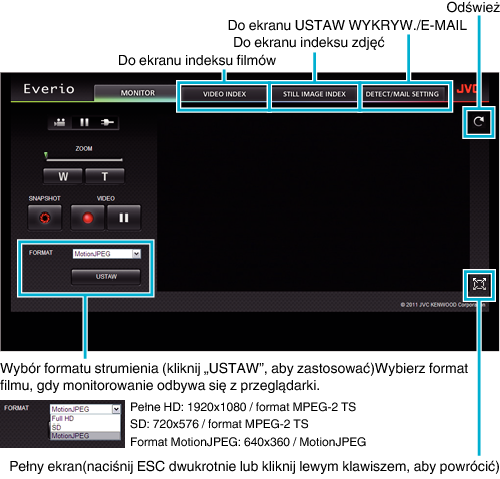 - Podczas formatem strumienia jest MotionJPEG, przycisk pełnego ekranu nie jest wyświetlany.