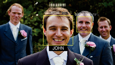 Yüzler algılandığında; çerçeveler, adlar ve gülümseme düzeyleri (%) görüntülenir. |