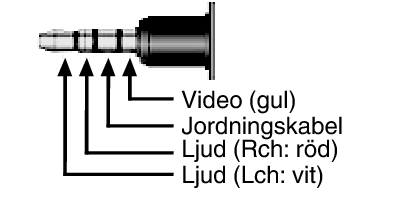 Specifikationer för kabeldragning (för video/ljud) för den 4-poliga minikontakten beskrivs nedan.