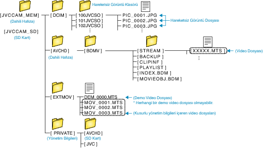 Klasör ve dosyalar, aşağıda gösterildiği gibi dahili hafıza ve SD kart içinde oluşturulur.