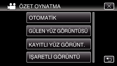 Aşağıdakilerden Özet Yeniden Oynatma türlerini seçin. “OTOMATİK„ seçildiğinde video önceden belirlenen bir süre uzunluğuna kısaltılarak yeniden oynatma yapılır.