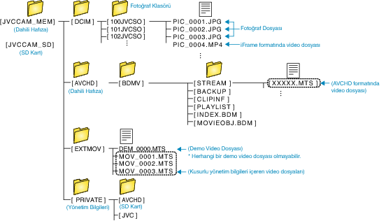 Klasör ve dosyalar, aşağıda gösterildiği gibi dahili hafıza ve SD kart içinde oluşturulur.