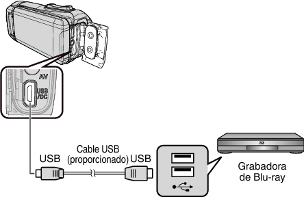 Puede copiar vídeos en calidad de alta definición mediante la conexión de un grabador Blu-ray compatible con AVCHD a esta unidad a través de un cable USB. Para obtener más información sobre la creación del disco, consulte el manual de instrucciones del grabador de Blu-ray.