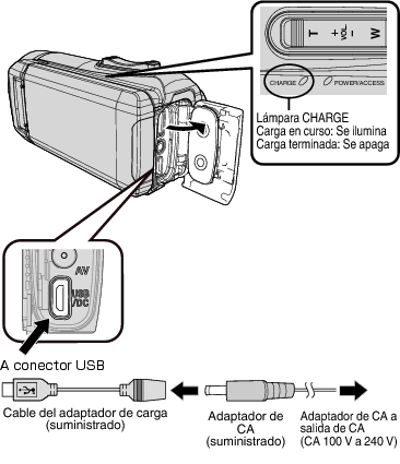 Puede grabar o reproducir vídeos durante la carga. (Sin embargo, el tiempo de carga será mayor al usual. Además, la carga restante de la batería puede disminuir dependiendo de las condiciones). Si la temperatura interna sube mientras usa la unidad, detenga la carga temporalmente. (La lámpara CHARGE se apaga).