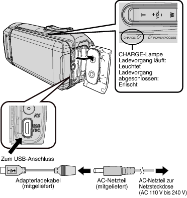 Während des Aufladens können Videos aufgenommen oder abgespielt werden. (Die Ladezeit wird dann jedoch länger als normal dauern. Zusätzlich kann die verbleibende Akkuleistung je nach den Bedingungen nachlassen.) Wenn die interne Temperatur während der Verwendung des Geräts ansteigt, beenden Sie das Aufladen zeitweise. (Die Lampe CHARGE erlischt.)