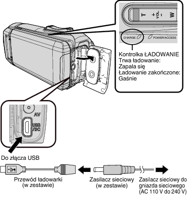 Podczas ładowania można nagrywać lub odtwarzać filmy. (Jednak czas ładowania będzie dłuższy niż zwykle. Ponadto, pozostały poziom naładowania akumulatora może spadać w zależności od warunków.) Jeśli wewnętrzna temperatura wzrośnie podczas korzystania z urządzenia, należy tymczasowo przerwać ładowanie. (Lampka CHARGE gaśnie.)