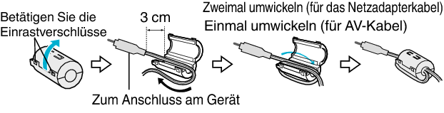 Das Anbringen des Kernfilters am Kabel des Netzadapters und an das AV-Kabel (am Ende an dieses Gerät angeschlossen) kann die Störungen reduzieren, die auftreten, wenn dieses Gerät an ein externes Gerät angeschlossen ist.