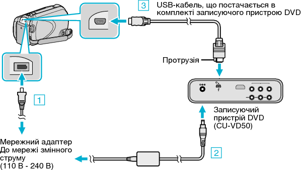 Копіювання> Запис дисків за допомогою пристрою для запису BD/DVD-дисків (GZ-HD620)> Підготовка пристрою для запису DVD-дисків (CU-VD50)
