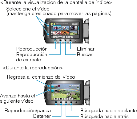 Puede seleccionar y reproducir los vídeos grabados desde la pantalla de índice (pantalla de vistas en miniatura).