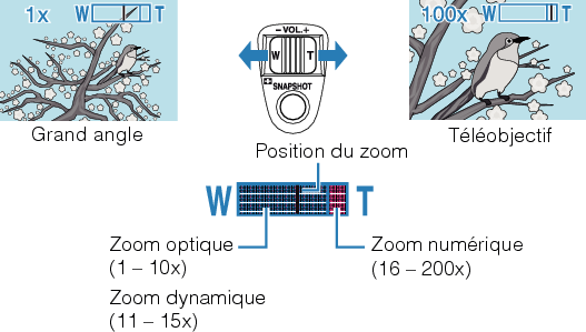 - Lorsque vous utilisez le zoom numérique, l’image devient granuleuse dans la mesure où elle est numériquement agrandie.