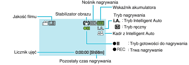 Wyświetla czas jaki upłynął od rozpoczęcia nagrywanego właśnie filmu. |