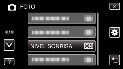 Grabación > Captura de sujetos con claridad (PRIORIDAD TOQUE AE/AF) > Captura automática de sonrisas (TOMA DE SONRISA) > Ajustar la visualización del NIVEL DE SONRISA (sólo imágenes fijas)