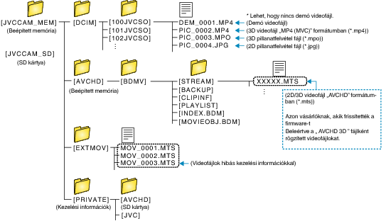A beépített memóriában és az SD kártyán az eszköz a következő ábrának megfelelően hozza létre a fájlokat és könyvtárakat.