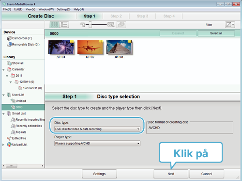 - Når der kopieres videoer, der er optagede i UXP-tilstand, til opretning af en AVCHD disk, skal videoerne konverteres til XP-optagelsestilstand, inden de kopieres. Det kan derfor tage længere tid end kopiering af videoer, der er optaget i andre tilstande.