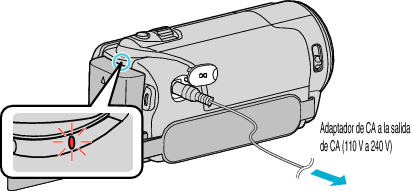 El tiempo de carga aplica cuando la unidad se utiliza a 25°C(77 °F). Si se carga la batería en un rango de temperatura ambiente que no se encuentre entre 10°C y 35°C(50 °F y 95 °F), la carga puede tardar más tiempo en realizarse o puede que no se inicie. El tiempo de grabación y reproducción también se puede acortar en determinadas condiciones de uso como por ejemplo a temperaturas bajas. - Si utiliza otro adaptador de CA que no sea el adaptador de CA suministrado, podrían ocurrir desperfectos.