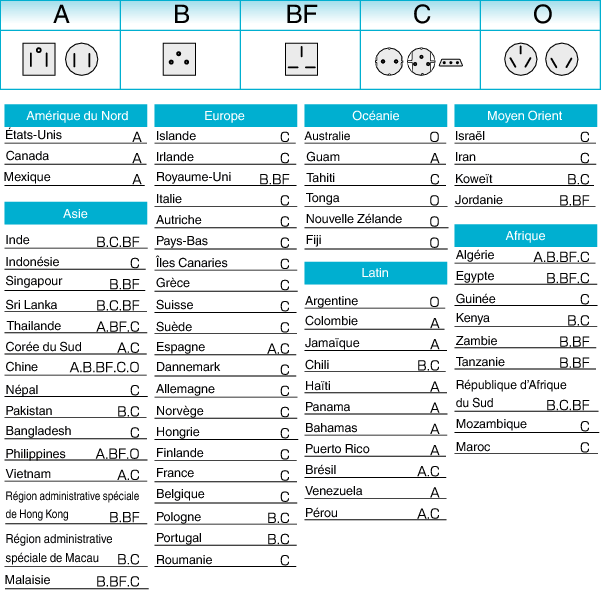 La forme de la prise de courant varie en fonction des pays et des régions.