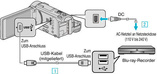 - Um im 50p-Modus aufgenommene Videos (wenn für „SYSTEMAUSWAHL“ die Option „50p“ gewählt wurde) zu kopieren, muss ein Blu-ray-Brenner verwendet werden, der mit AVCHD Progressive kompatibel ist.