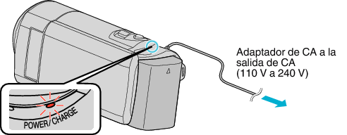 La luz de CARGA titila 2 veces en un ciclo lento para notificar que la carga de la batería no se inicia. Asimismo, tenga en cuenta que el tiempo de grabación y reproducción también se puede acortar en determinadas condiciones de uso como por ejemplo a temperaturas bajas. - En caso de desperfectos (sobrevoltaje, etc.), o si se intenta utilizar otra batería que no sea la fabricada por JVC para cargar la batería, la carga se detendrá. En estos casos, la luz de CHARGE titila rápido para dar aviso.