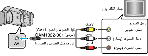 لتشغيل مقاطع الفيدو على التلفزيون، قم بتوصيل كابل الصوت والصورة AV المرفق (P/N QAM1322-001) بطرف الصوت والصورة الخاص بهذه الوحدة.