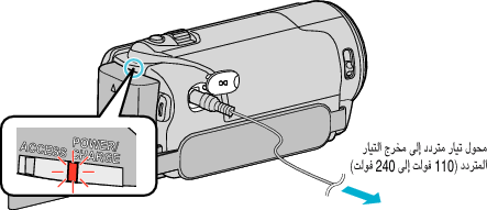 يمكنك تشغيل أو عرض ملفات الفيديو أثناء توصيل محول التيار المتردد. (لا يمكن شحن البطارية أثناء التسجيل أو العرض.) قم بإزالة البطارية عند استخدام الوحدة لفترة طويلة. قد يتأثر أداء البطارية سلبا إذا كانت موصلة بالوحدة.