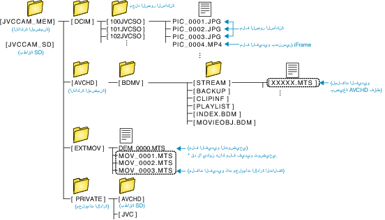 يتم إنشاء المجلدات والملفات في الذاكرة الداخلية وبطاقة SD كما هو موضح أدناه.