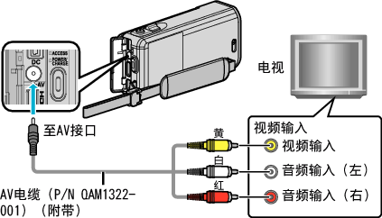 如要在电视上播放视频,则将附带的AV电缆(P/N QAM1322-001)连接本机的AV终端。