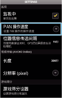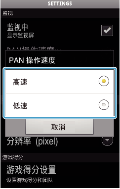 经由智能电话更改摇摄架的运行速度。在这2项中选取一项:“高速”或“低速”。