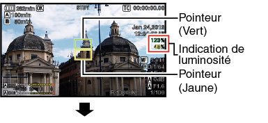 Un pointeur indiquant l’emplacement et la luminosité (en %) de cet endroit sont affichés dans les images montrées sur l’écran ACL et l’écran du viseur.