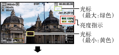 此项功能可以让您无需依靠影像处理(例如伽玛曲线)而查看从镜头输入的影像的亮度。摄像机的动态范围是400 %,显示的亮度范围为0 % - 400 %及更高。