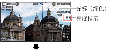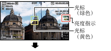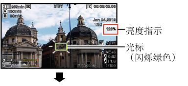 指示位置的光标以及该位置的亮度(%)会出现在LCD显示屏和取景器屏幕所显示的影像上。