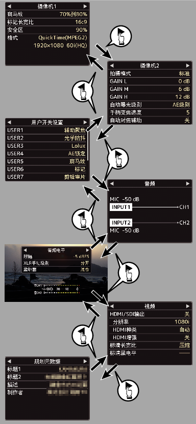 在每个状态屏幕中([摄像机1]/[摄像机2]屏幕以外)按[MENU]按键可进入设置屏幕。