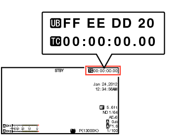 TOP回放或录制时,时间码和用户位会显示在取景器和LCD显示屏上。(显示屏幕)