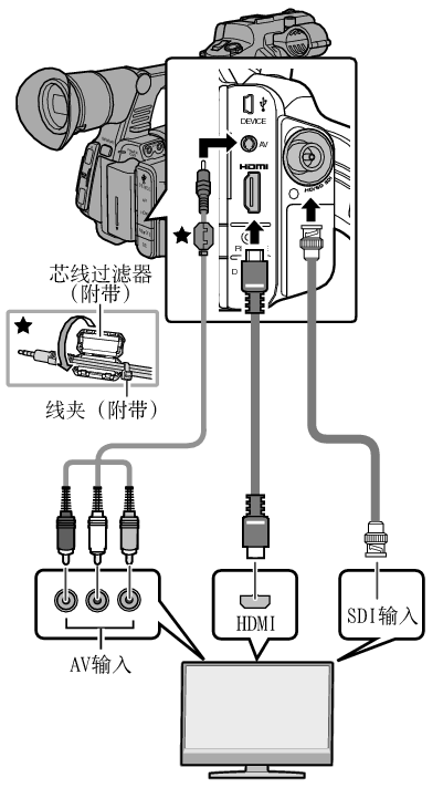 TOP要将现场或回放视频影像以及音频输出到外部显示器上,请从摄像机上选择输出信号,然后根据要使用的显示器选用合适的电缆进行连接。