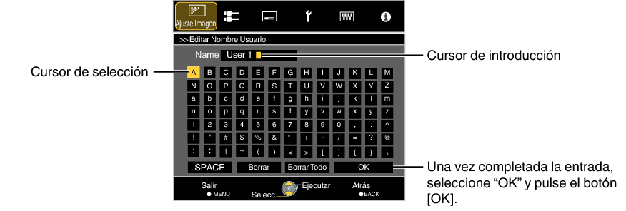 Puede editar los nombres de “User 1” a “User 6” en el modo de imagen.
