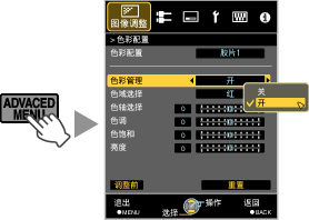 TOP按[ADVANCED MENU]键以显示“色彩配置”菜单