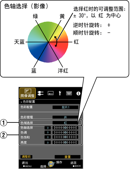 根据所选择的“色彩配置”的设置,您可以根据您的喜好调整以下各个颜色: 红、 黄、 绿、 天蓝、 蓝 和 洋红。