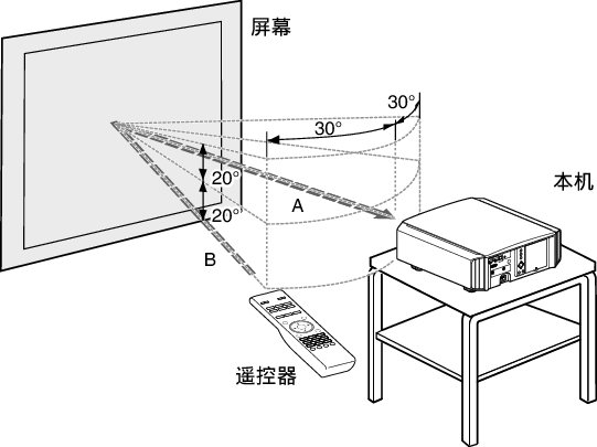 确保距离A(本机与屏幕之间的距离)和距离B(遥控器与屏幕之间的距离)的总和在7米内。